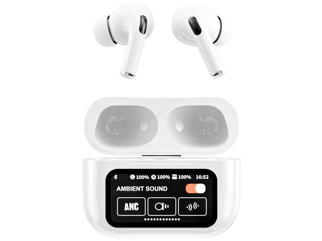 Bezdrátová sluchátka FIRO A9 Pro s technologií ANC / ENC pro odstraněním okolního hluku a nerušený poslech hudby. Dobíjecí box s dotykovým displejem pro pohodlné ovládání funkcí.