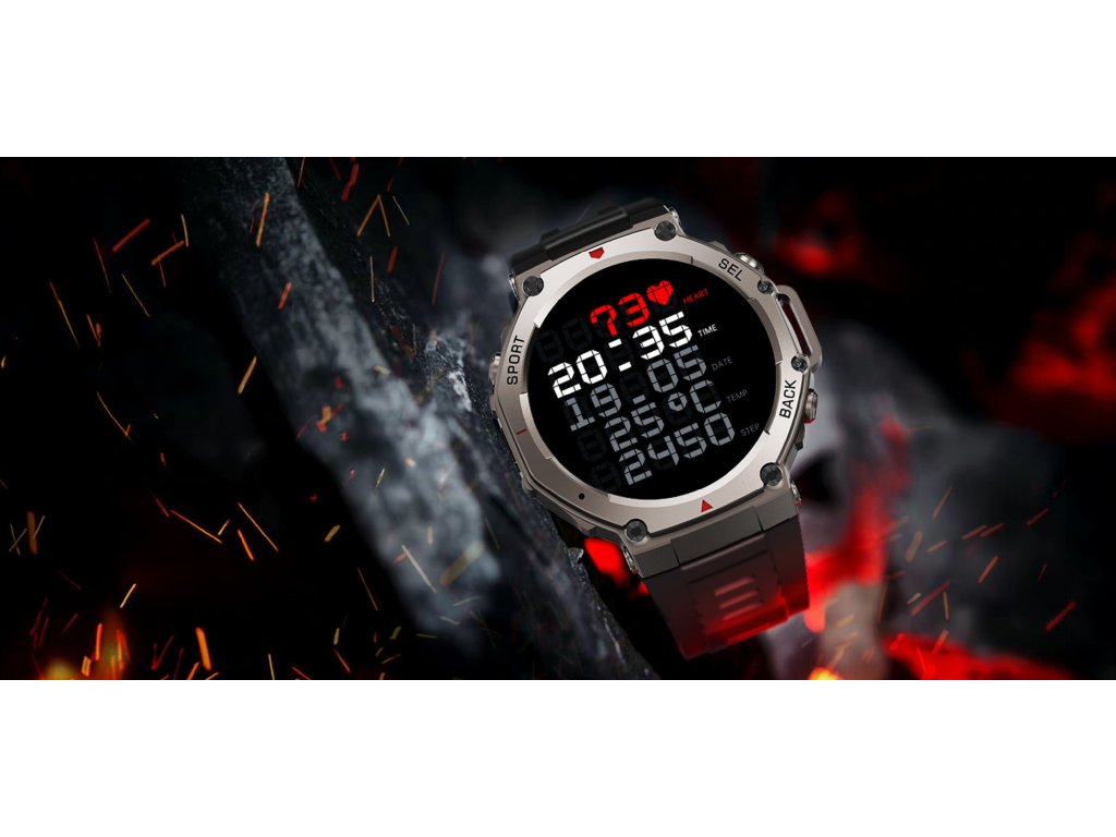 Chytré hodinky EVOLVE X10 Ultra s AMOLED displejem, extrémně odolným pouzdrem, tvrzeným Corning Gorilla Glass sklem a silikonovým řemínkem.