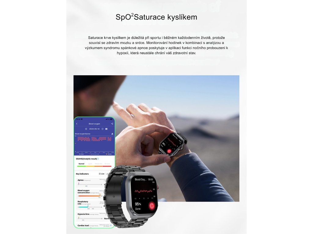 SpO2 - saturace kyslíku v krvi nás informuje o kvalitě transportu kyslíku do tkání a udává se v procentech označujících míru kyslíku navázaného na hemoglobin. Okysličení krve je jednou z nejdůležitějších hodnot, které sledují sportovci během výkonu. Nedostatek kyslíku v krvi má za následek pokles výkonu, rozptýlenou soustředěnost, opožděné reakce, ale také zvracení. Hodinky mají senzor pro měření množství kyslíku v krvi během výkonu i běžného nošení.
