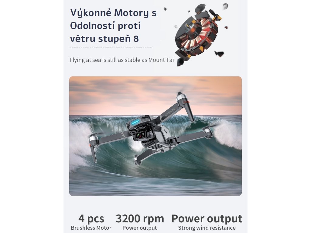 Vysoce spolehlivé a výkonné motory mají nízkou spotřebu a zároveň dávají dronu potřebný výkon až 3200 otáček za minutu s rychlostí letu až 62,8Km/h. Hladký let si tak užijete za silnějšího větru se stupněm 8 třeba u moře nebo v horách.