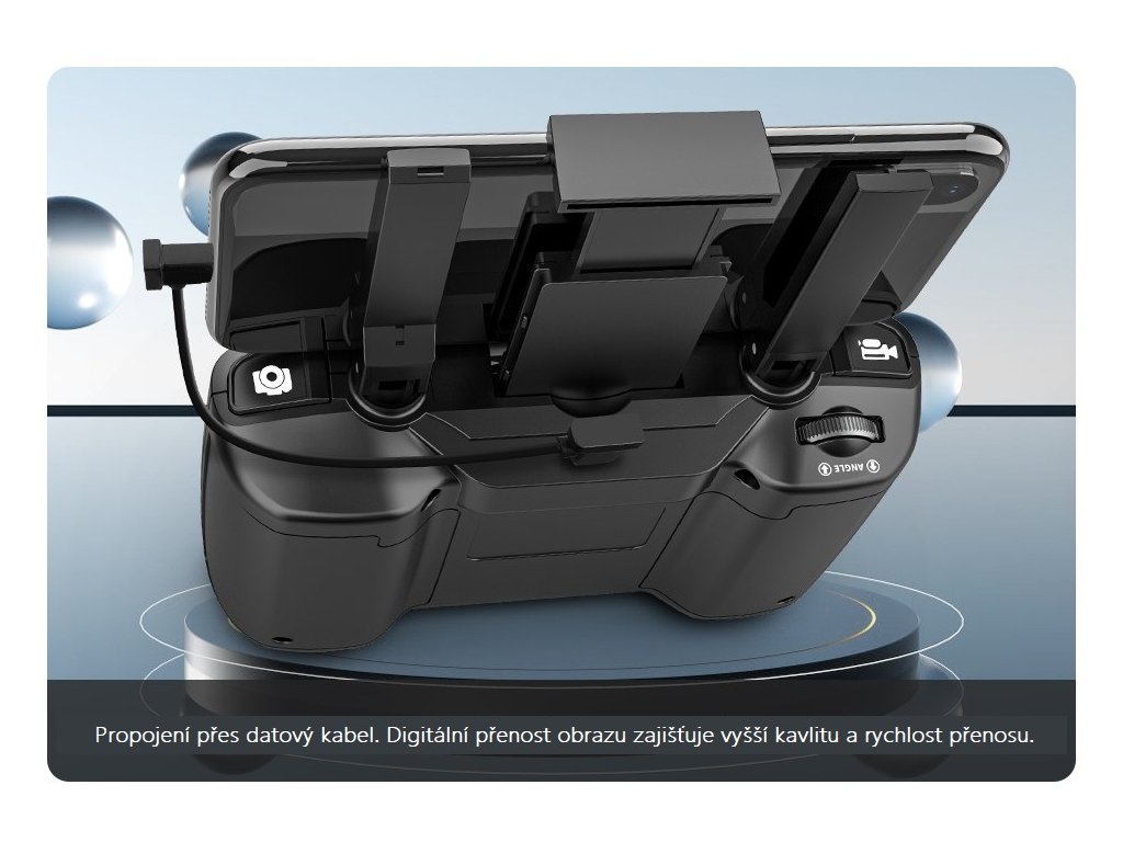 Dálkové ovládání s displejem má dosah až 5000m v otevřeném prostoru. Obraz mezi dronem a aplikací se přenáší pomocí digitál í technologie s dosahem až 3000m. Pro vysoké rozlišení fotografií a hladké video je dron s mobilním telefonem propojený přes datový RC kabel USB-C.