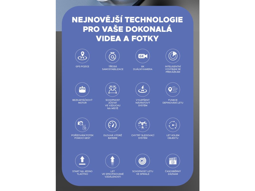 Vysoce spolehlivé a neporuchové bezkomutátorové motory typ 1503 mají nízkou spotřebu a zároveň dávají dronu potřebný výkon i za silnějšího větru. To vše doplňuj GPS navigace a 6osý giroskop. Díky GPS má dron nejen výrazně lepší letové vlastnosti, ale také pokročilé funkce jako automatický návrat jedním tlačítkem, návrat při nízkém stavu baterie, návrat při ztrátě dosahu ovladače, nalezení ztraceného dronu a režim ztráty orientace.