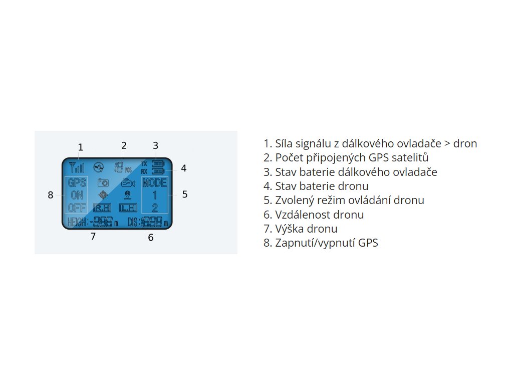 Na displeji dálkového ovladači se zobrazují letové informace a informace o samotné dronu: