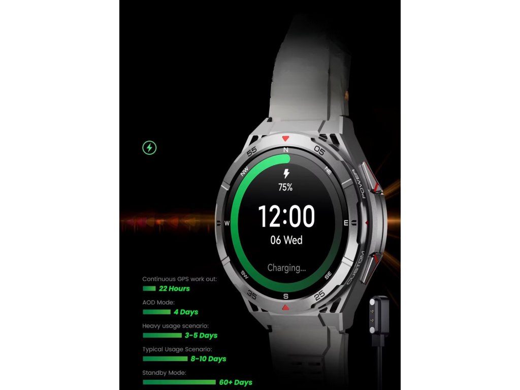 Chytré hodinky EVOLVE X2 Ultra Vás nenechají bez energie. Baterie s vysokou kapacitou, úsporný čip a Bluetooth 5.3 umožňují až 12 dní používání bez dobíjení