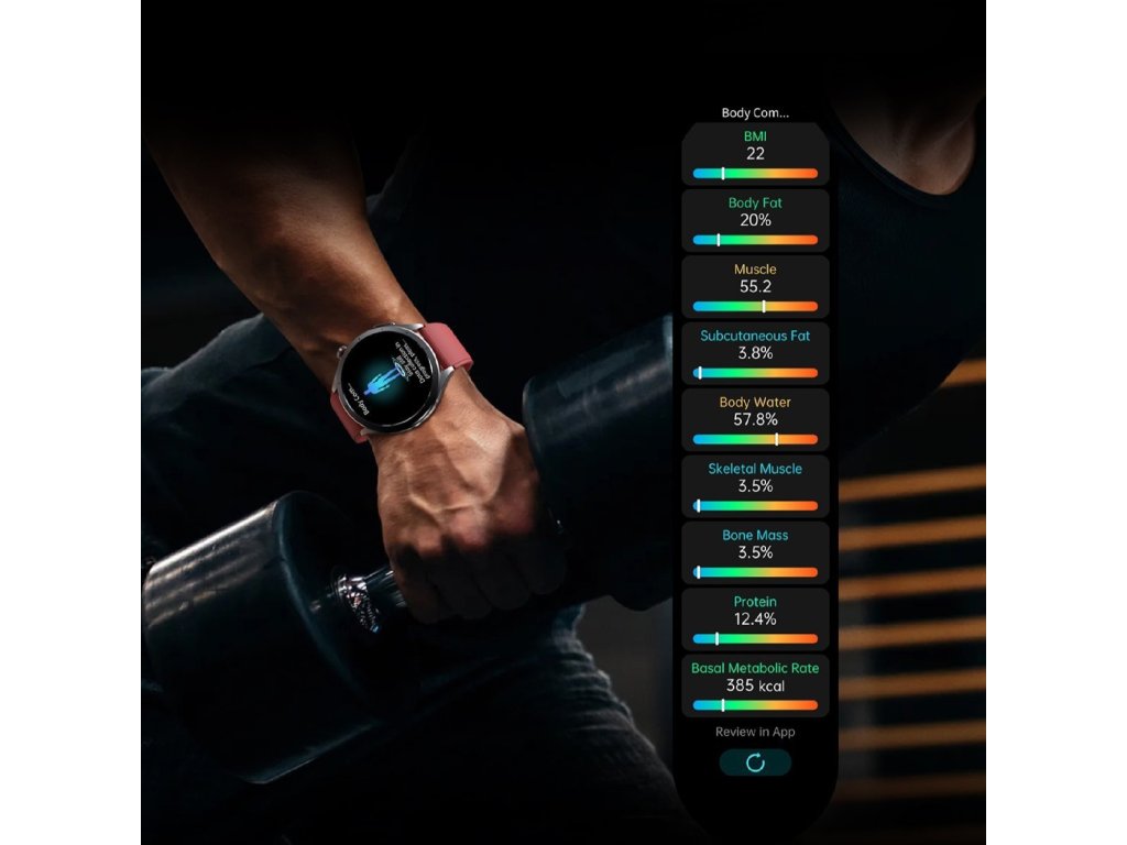 Složení těla - kombinace boční elektrody a optického senzoru umožňují analýzu složení těla. Během chvilky se dozvíte informace o svém aktuálním BMI indexu, množství tělesného tuku, svalstva, podkožního tuku, vody v těle, kosterního svalstva, kostní hmoty, proteinu a bazální rychlosti metabolizmu. Naměřené hodnoty můžete využít v tréninku nebo dietě.