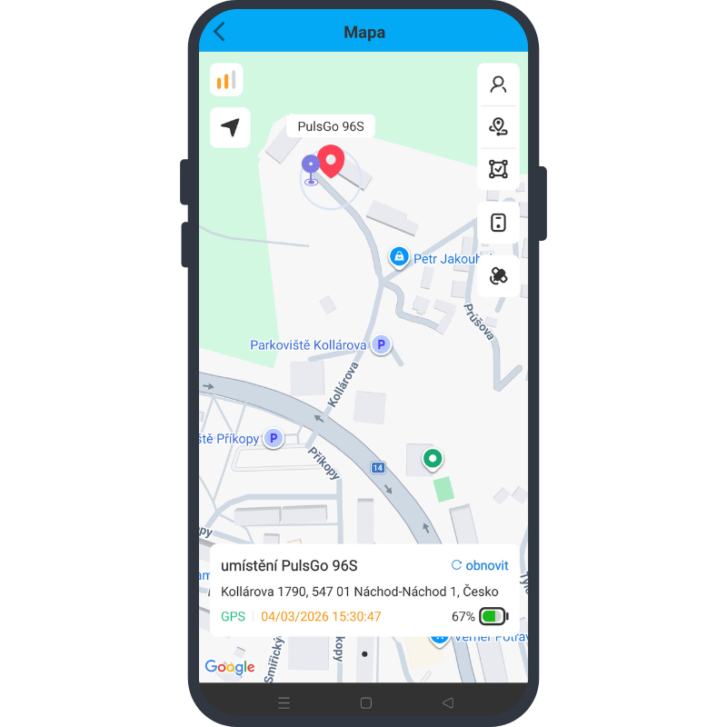 Díky SOS náramku PulsGo ACTIVE S8 budete mít vždy přehled o tom, kde se vaši blízcí právě nachází. Náramek je vybavený GPS modulem a využívají kombinaci satelitních systémů GPS a Beidou pro přesné určení polohy v reálném čase s přesností na jednotky metrů. V mobilní aplikaci si můžete kdykoliv zobrazit a zkontrolovat polohu na přehledných Google mapách a ujistit se, že je vše v pořádku. Pokud to situace vyžaduje, přímo v rozhraní mapy lze spustit navigaci do místa poslední polohy hodinek.