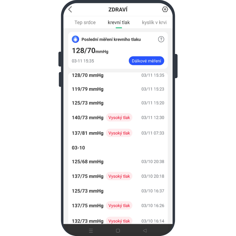 Pokud chcete mít přehled o vývoji zdravotního stavu i bez neustálé kontroly a zapínání měření, je možné aktivovat automatické měření v pravidelných intervalech - náramek spustí měření každých 5, 10, 30, nebo 60 minut a naměřené hodnoty uloží do mobilní aplikace. V té se kdykoliv podíváte na aktuální hodnoty nebo vývoj měření až 30 dní zpětně. Naměřené hodnoty lze využít jako podnět k návštěvě lékaře nebo první kontrolu při náhlém pocitu zhoršení zdravotního stavu.
