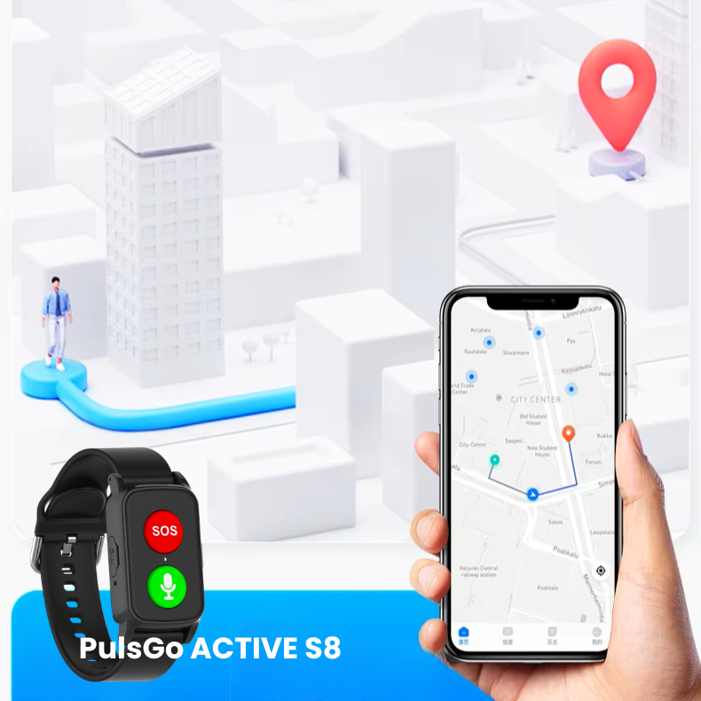 SOS náramek pro seniory PulsGo ACTIVE S8 se snadným ovládáním, GPS určováním polohy, detekcí pádu, voláním a orientačním měřením zdraví.
